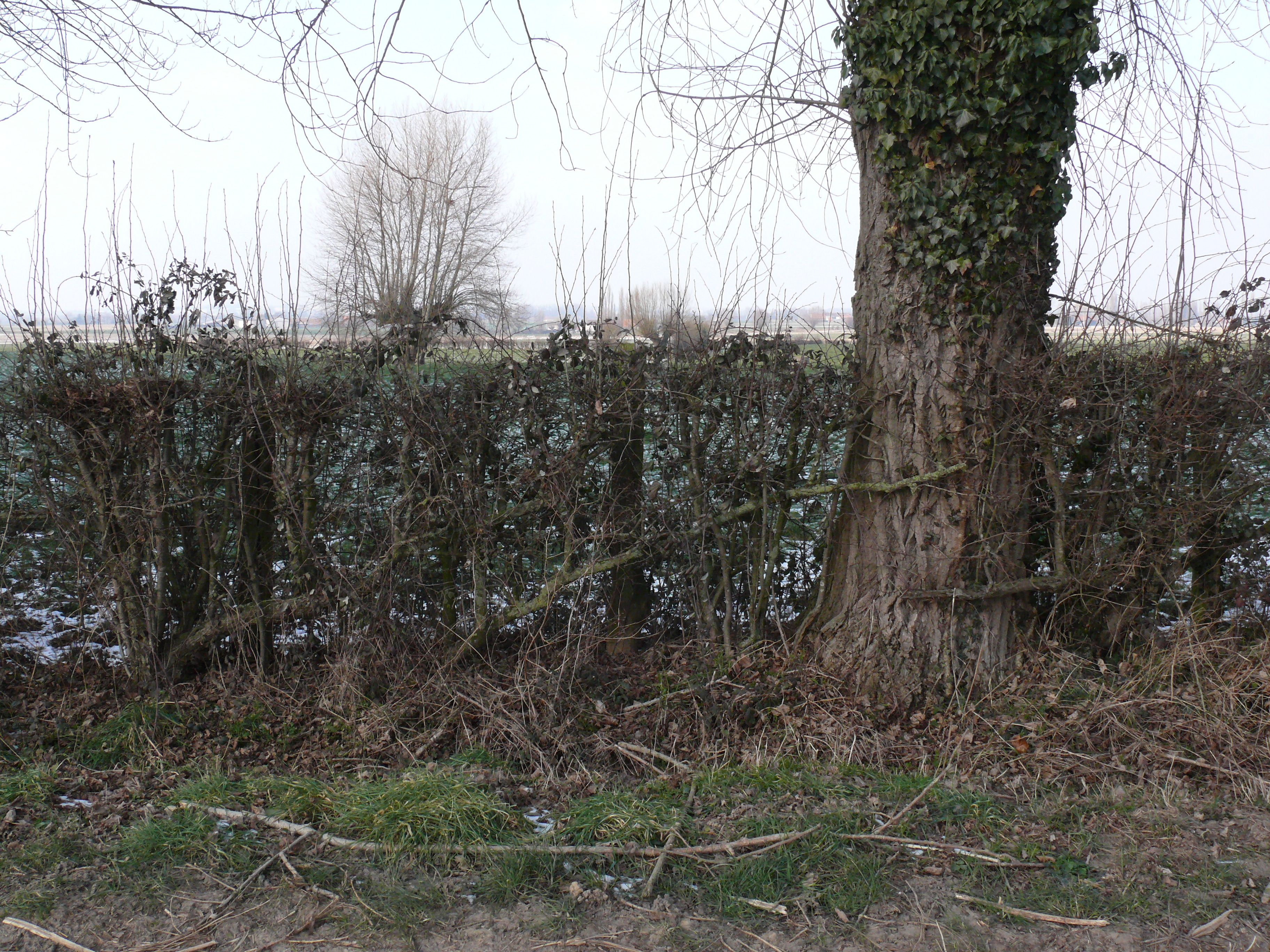 Brabantstraat. Knotbomenrij en gelegde weerhaag.