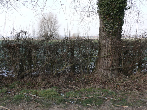 Brabantstraat. Knotbomenrij en gelegde weerhaag.