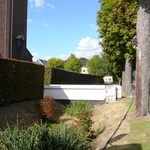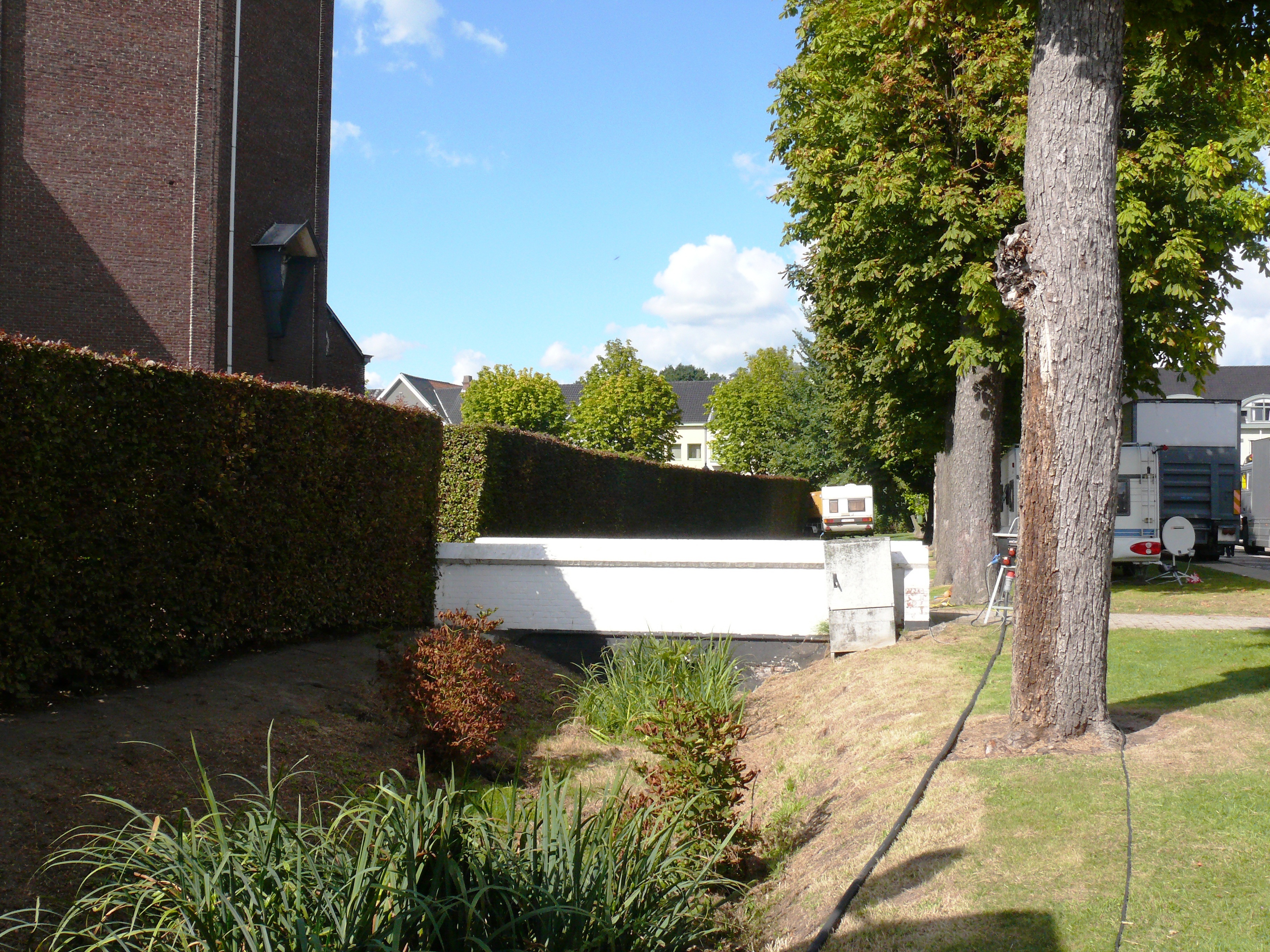 Kerkhof. Lijnaanplanting met gekandelaarde paardenkastanjes.
