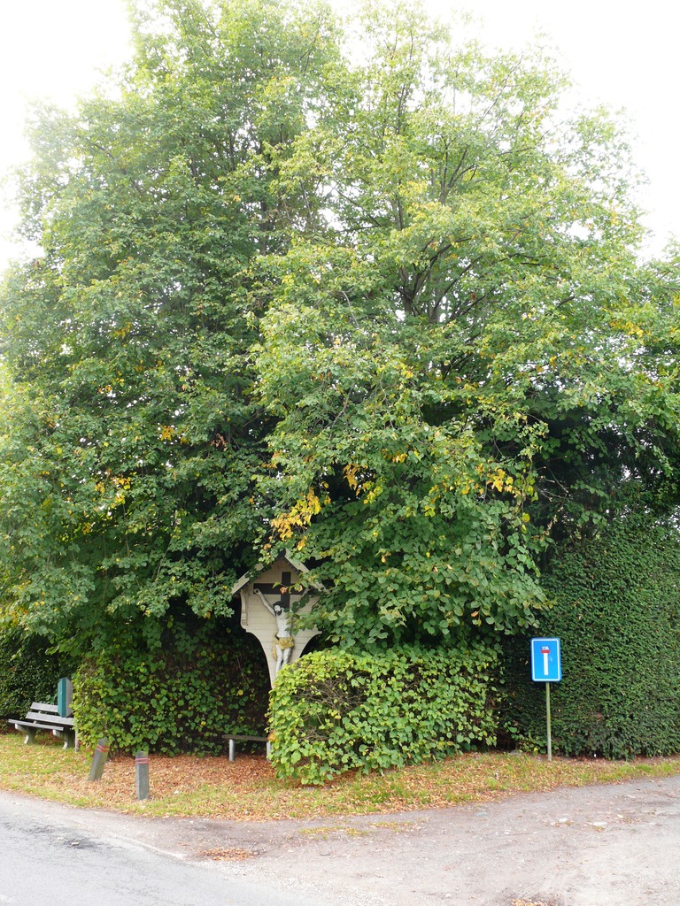 Bosstraat 15. Wegkruis met 2 gakandelaarde lindes.