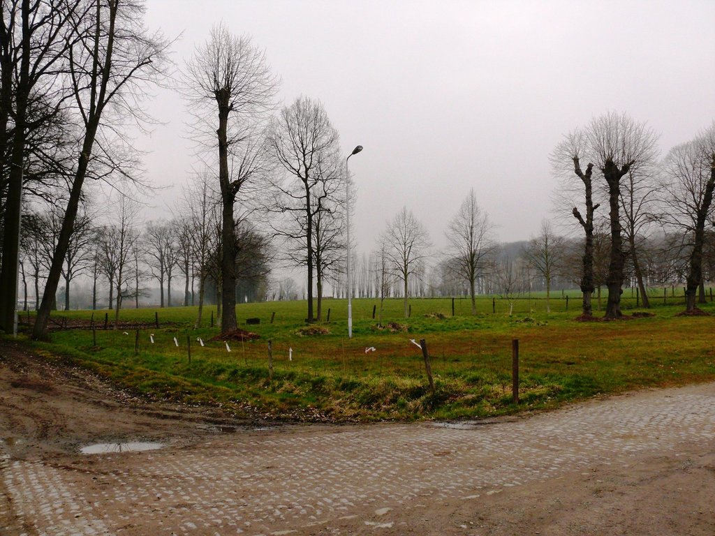 Kasteeldomein van Leeuwergem. Plein tussen dubbele kasteeldreef en voorhof.
