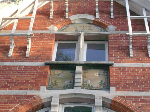 Voorgevel: geveltop met jaartal en rozenpaneel