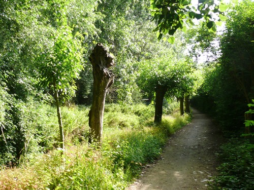 Grimbergen Tommenmolenstraat knotbomenrij langs Maalbeek