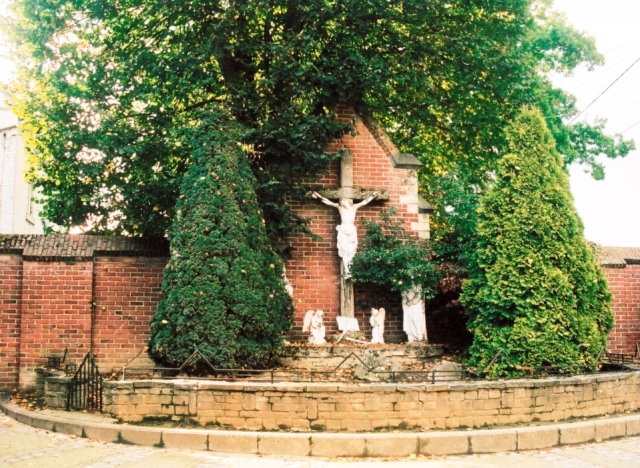 Calvarietuin tijdens het interbellum gebouwd tegen de pastoriemuur in de Peuskensstraat