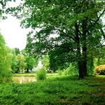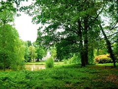 Het Elzenhof van over de vijver, met een azaleamassief en veldje douglasspirea
