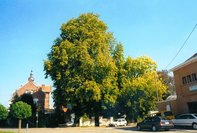 De achterzijde van de tuin bij het huis aan het Werchterplein 27, met een geelbladige es en de monumentale nu verdwenen paardenkastanje