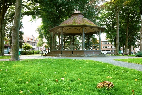 Het marktplein van Zichem met kiosk en verminkte beuken, 80 jaar na de aanleg. De reuzenzwam op de voorgrond gedijt op het wortelgestel van een verdwenen beuk.