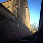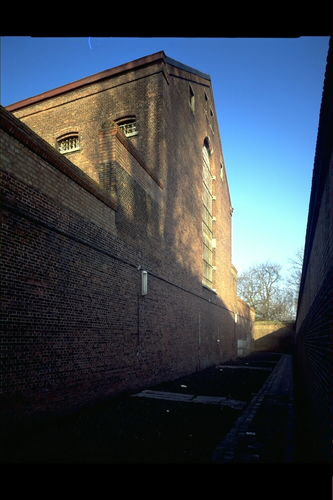 Het Pandreitje, historisch gevangenisgebouw: exterieur, zijgevel cellenblok met groot raam van de centrale gang, algemeen zicht (gesloopt in 1992)