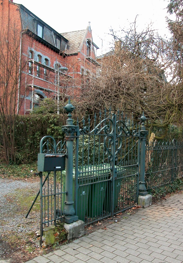 De afbeelding 'Inrijhek en met blauwe regen overgroeide smeedijzeren gloriëtte van de voortuin van Luikersteenweg nummer 51' gemaakt door De Maegd, Christiane wordt ter beschikking gesteld door Agentschap Onroerend Erfgoed (AOE) onder de volgende voorwaarden: Modellicentie voor gratis hergebruik, Naamsvermelding 4.0 Internationaal.