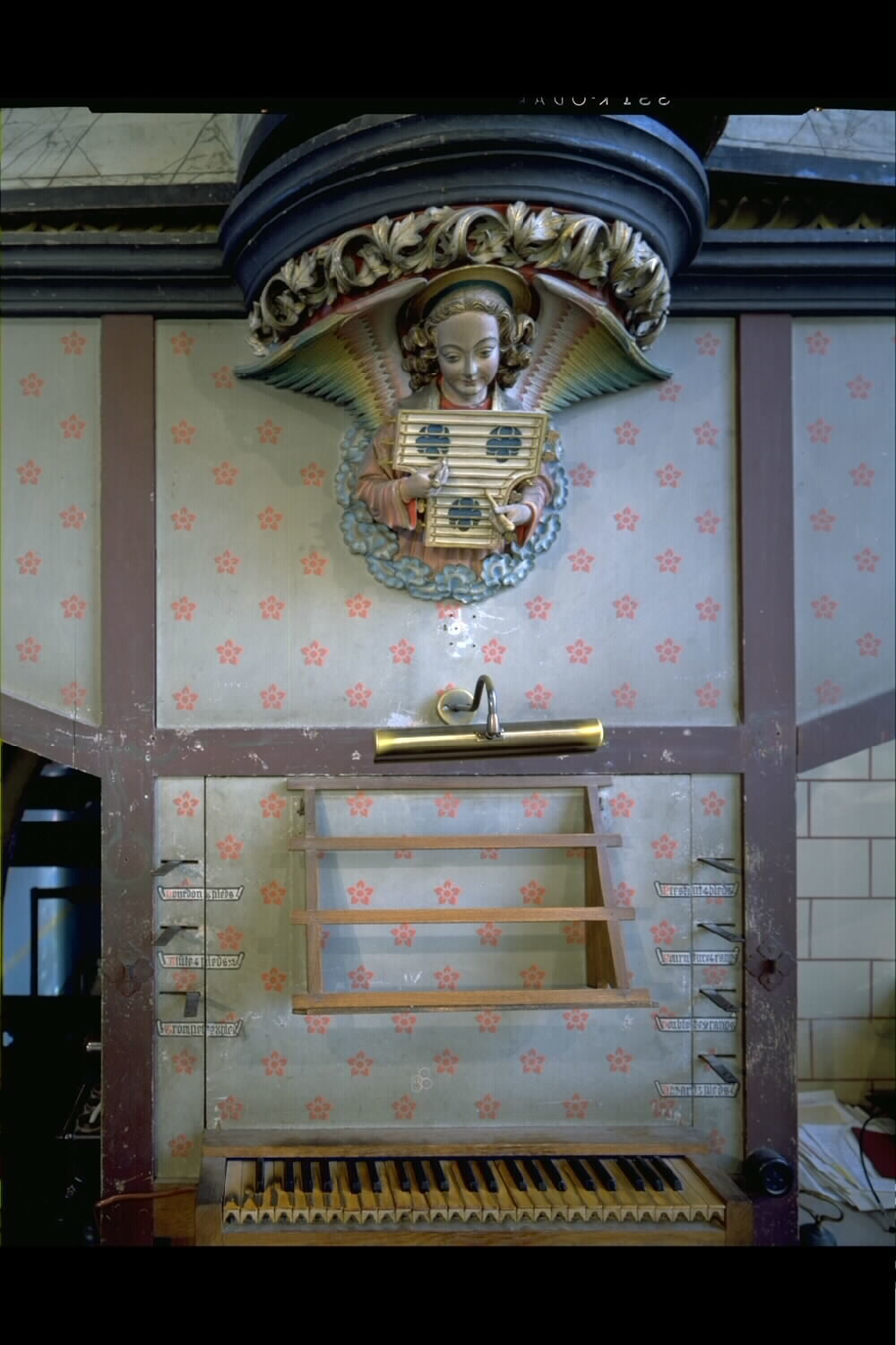 orgel, klaviatuur en citerspelende engel: detail