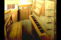 Orgel: klaviatuur, met organistenbank en een deel van de doksaalbalustrade