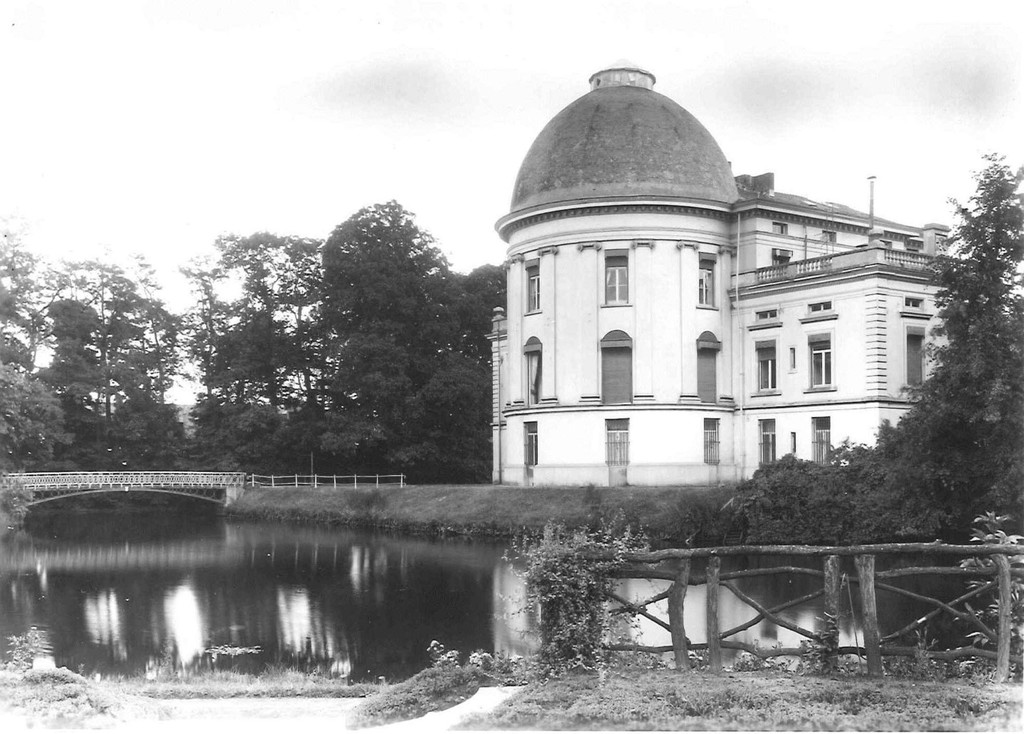 Datum van opname niet gekend: de halfronde uitbouw achteraan werd in de 20ste eeuw vervangen door een rechthoekig uitspringend risaliet bekroond door een hoofdgestel met driehoekig fronton boven de drie traveeën brede pilastergevel.
