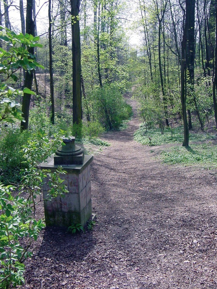 De betonnen sokkel en de voet van een verdwenen tuinvaas in het park van de Sint-Alenatoren te Dilbeek
