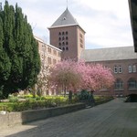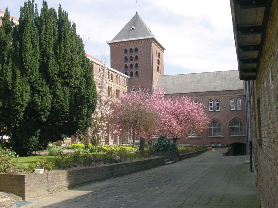 M&L Cahier 11 Historische tuinen en parken van Vlaanderen. Pajottenland - Zuidwesten van Vlaams Brabant, p. 72: de hof tussen het noviciaat en het voormalige priesterhuis, met kruispad, Ierse taxussen en Japanse kerselaars, vroeger met linden; de toren is typisch voor de kerkenbouw rond 1950; de arduinen zuiltjes zijn afkomstig van een verdwenen tuinpaviljoen