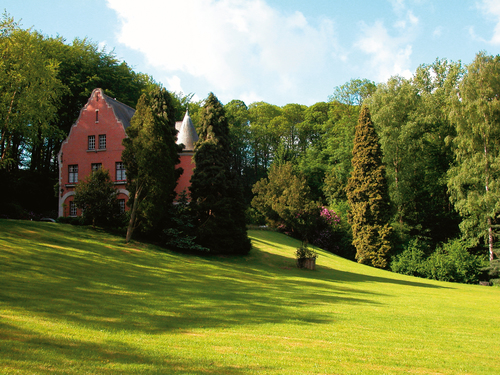 De landschappelijke beplanting, vaak cipresachtigen, op de glooiing ten noordwesten van de in 1928 gebouwde kasteelvilla