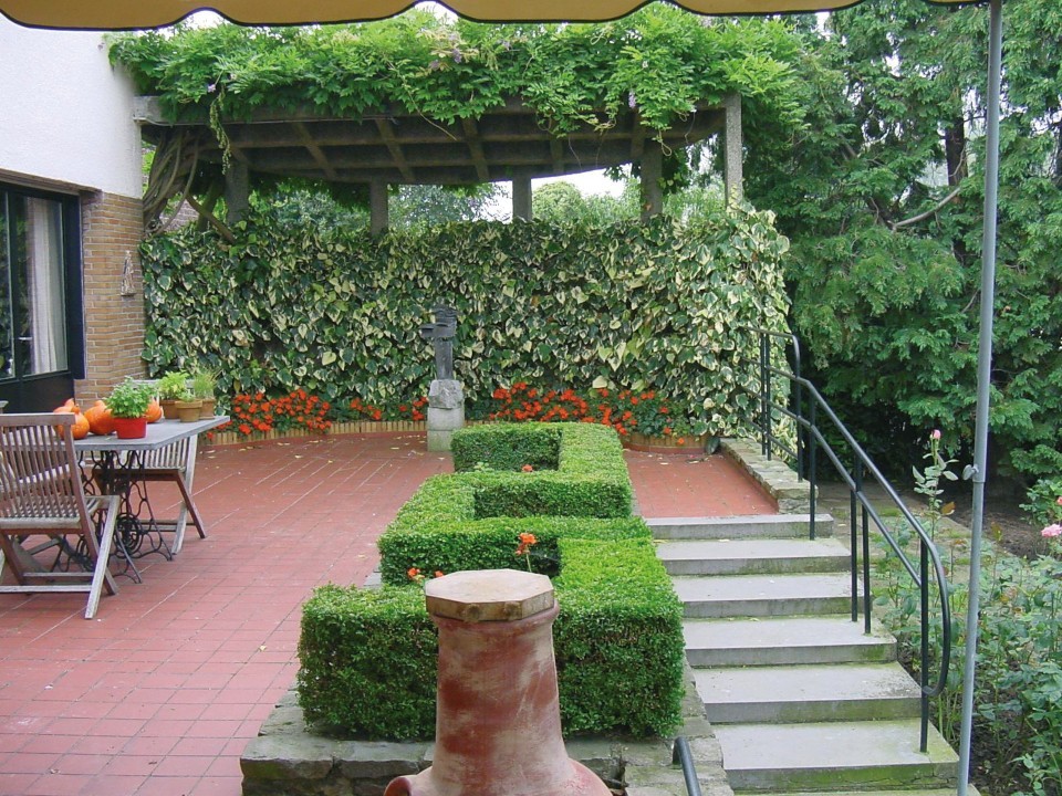 Het bovenste terras met de halfronde betonnen pergola sloot aan bij de woonkamer en werd ontworpen door Hoste; Canneel had het op zijn eigen ontwerp blanco gelaten
