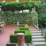Het bovenste terras met de halfronde betonnen pergola sloot aan bij de woonkamer en werd ontworpen door Hoste; Canneel had het op zijn eigen ontwerp blanco gelaten