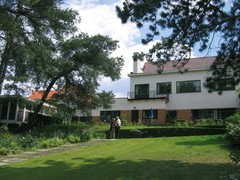 De sobere achtergevel van de woning Heeremans en de vaste plantenborder; de taluds van de terrassen en het zigzagpad gaan schuil achter massieven van Linicera nititda