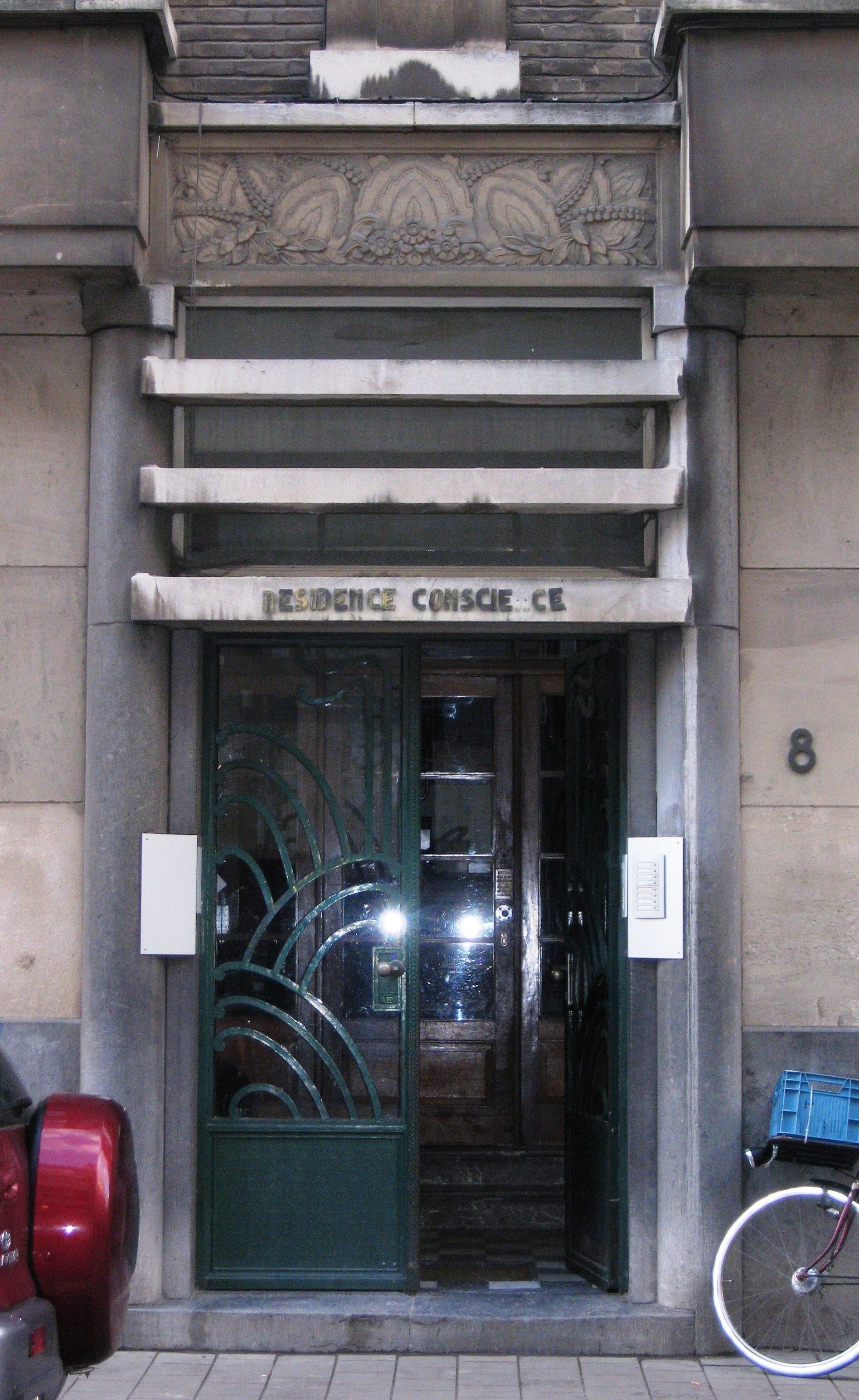 De afbeelding 'Antwerpen Consciencestraat 8 portaal' gemaakt door Braeken, Jo wordt ter beschikking gesteld door Agentschap Onroerend Erfgoed (AOE) onder de volgende voorwaarden: Modellicentie voor gratis hergebruik, Naamsvermelding 4.0 Internationaal.