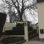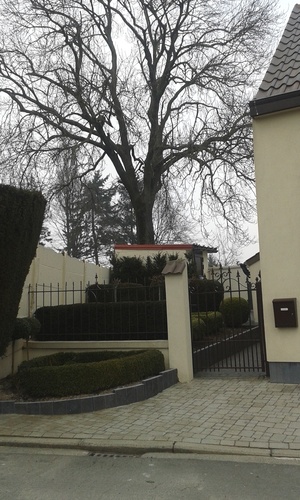 Opgaande es als hoekboom bij kerkhof
