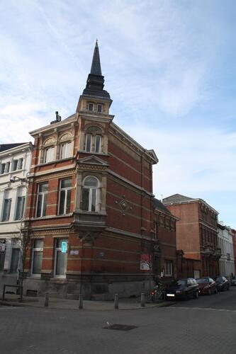 De afbeelding 'Ensemble met politiebureel' gemaakt door Hooft, Elise wordt ter beschikking gesteld door Agentschap Onroerend Erfgoed (AOE) onder de volgende voorwaarden: Modellicentie voor gratis hergebruik, Naamsvermelding 4.0 Internationaal.