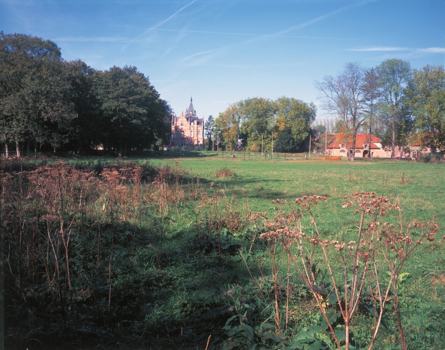 Alle rechten op de afbeelding 'Zicht vanuit het zuidoosten op het kasteel, het voormalige brouwerij-herbergcomplex en de parkuitbreiding van 1919.' gemaakt door Pauwels, Oswald zijn voorbehouden aan Pauwels, Oswald.