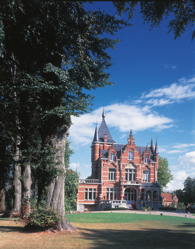 Het in 1890 door Bertrand in Boutersem gebouwd kasteel vanuit het zuiden, met enkele van de oudste bruine beuken op de voorgrond.