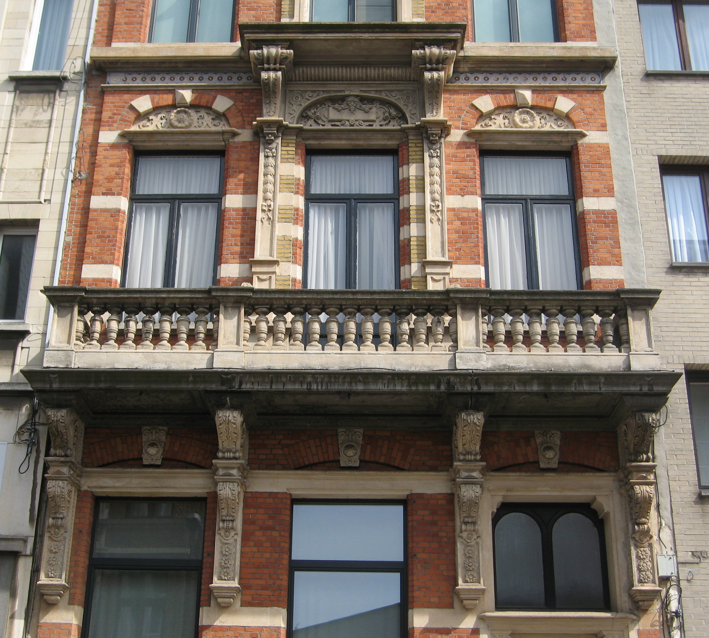 De afbeelding 'Antwerpen Lamorinièrestraat 163 balkon' gemaakt door Braeken, Jo wordt ter beschikking gesteld door Agentschap Onroerend Erfgoed (AOE) onder de volgende voorwaarden: Modellicentie voor gratis hergebruik, Naamsvermelding 4.0 Internationaal.