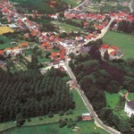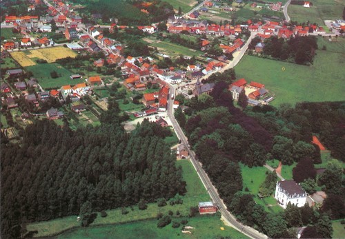 Het Vijverhof in vogelperspectief; de bruine beukendreef tussen het kasteel en de dorpskerk; rechts van de kerk de Korbeekhoeve, rechts bovenaan de pastorie van Korbeek-Lo.