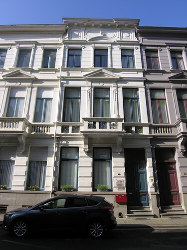 De afbeelding 'Neoclassicistische huizenrij' gemaakt door Hooft, Elise wordt ter beschikking gesteld door Agentschap Onroerend Erfgoed (AOE) onder de volgende voorwaarden: Modellicentie voor gratis hergebruik, Naamsvermelding 4.0 Internationaal.