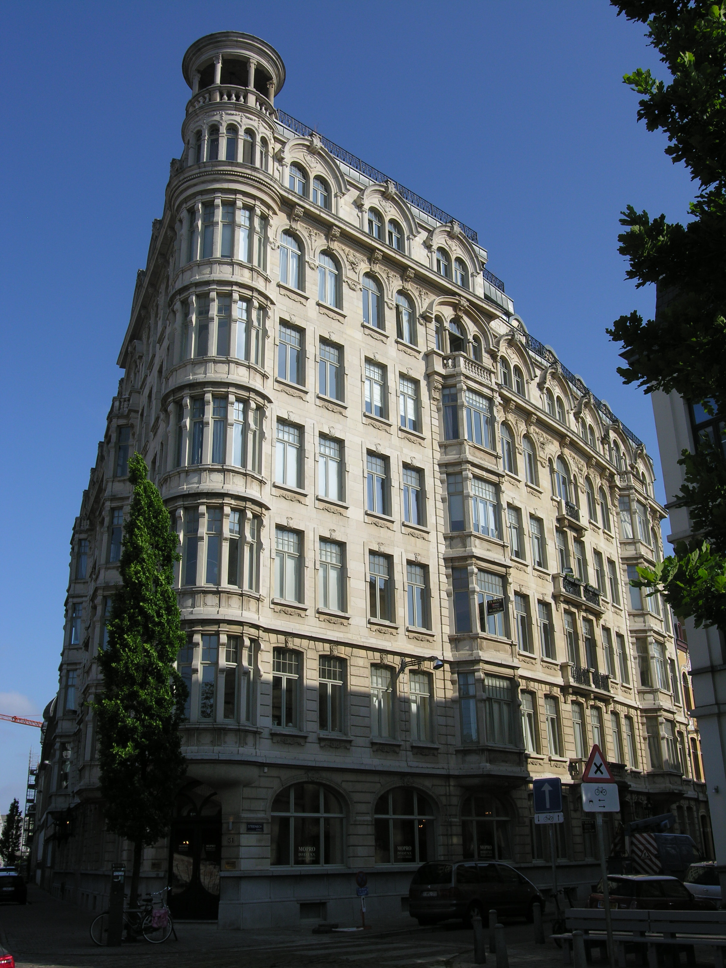 De afbeelding 'Imposant appartementsgebouw' gemaakt door Hooft, Elise wordt ter beschikking gesteld door Agentschap Onroerend Erfgoed (AOE) onder de volgende voorwaarden: Modellicentie voor gratis hergebruik, Naamsvermelding 4.0 Internationaal.