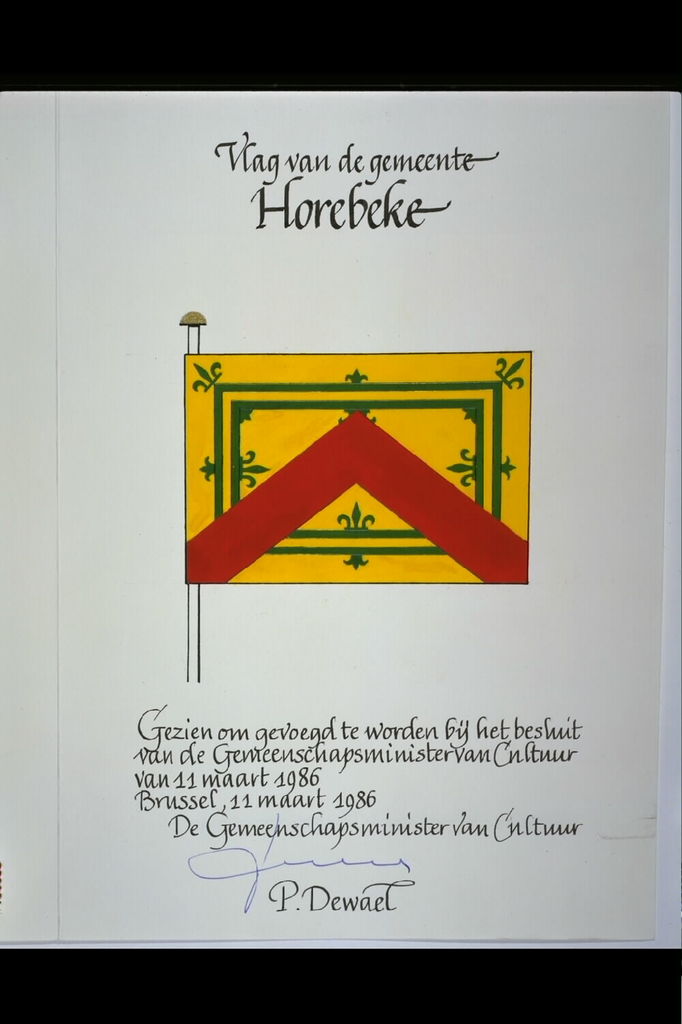 De afbeelding 'Horebeke Vlag' wordt ter beschikking gesteld door Agentschap Onroerend Erfgoed (AOE) onder de volgende voorwaarden: Modellicentie voor gratis hergebruik, Naamsvermelding 4.0 Internationaal.