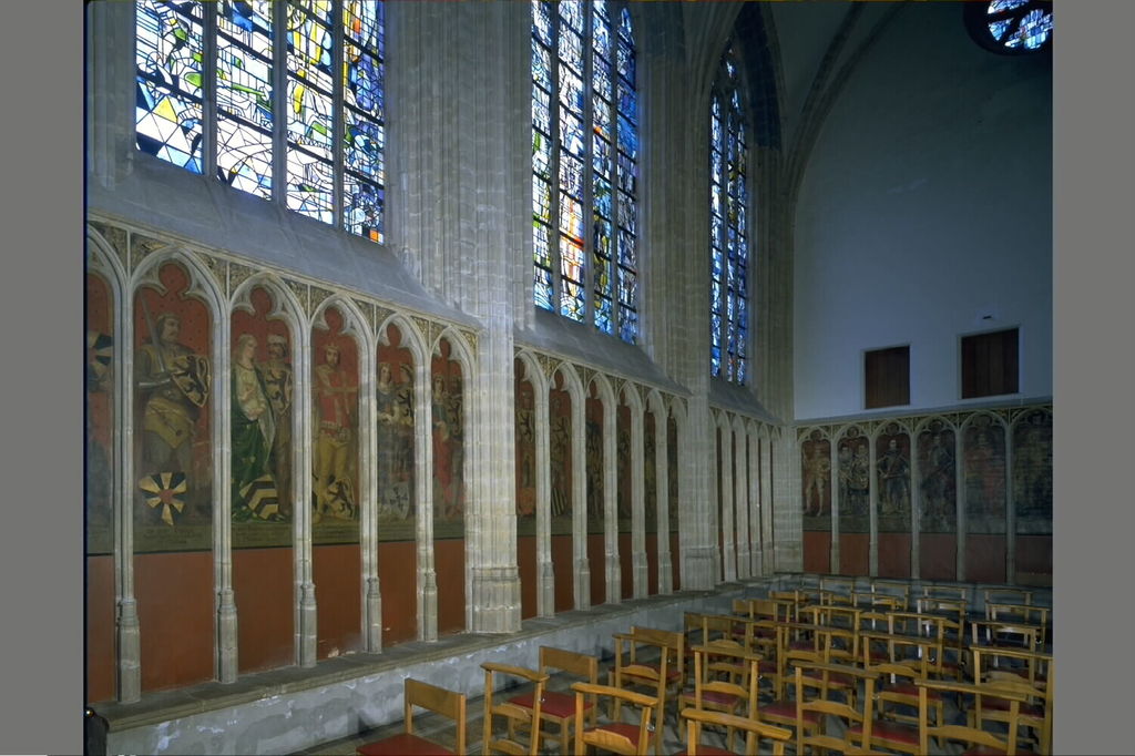Parochiekerk O.-L.-Vrouw, Sint-Catharinakapel: interieur, graven- en gravinnenportretten (herschilderd door J. Vander Plaetsen, 1870), algemeen zicht op zuidwand