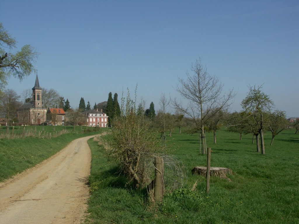 Borgloon, Bommerhoven, Weg met boomgaard, meidoornhaag en kerk en kasteel van Bommershoven