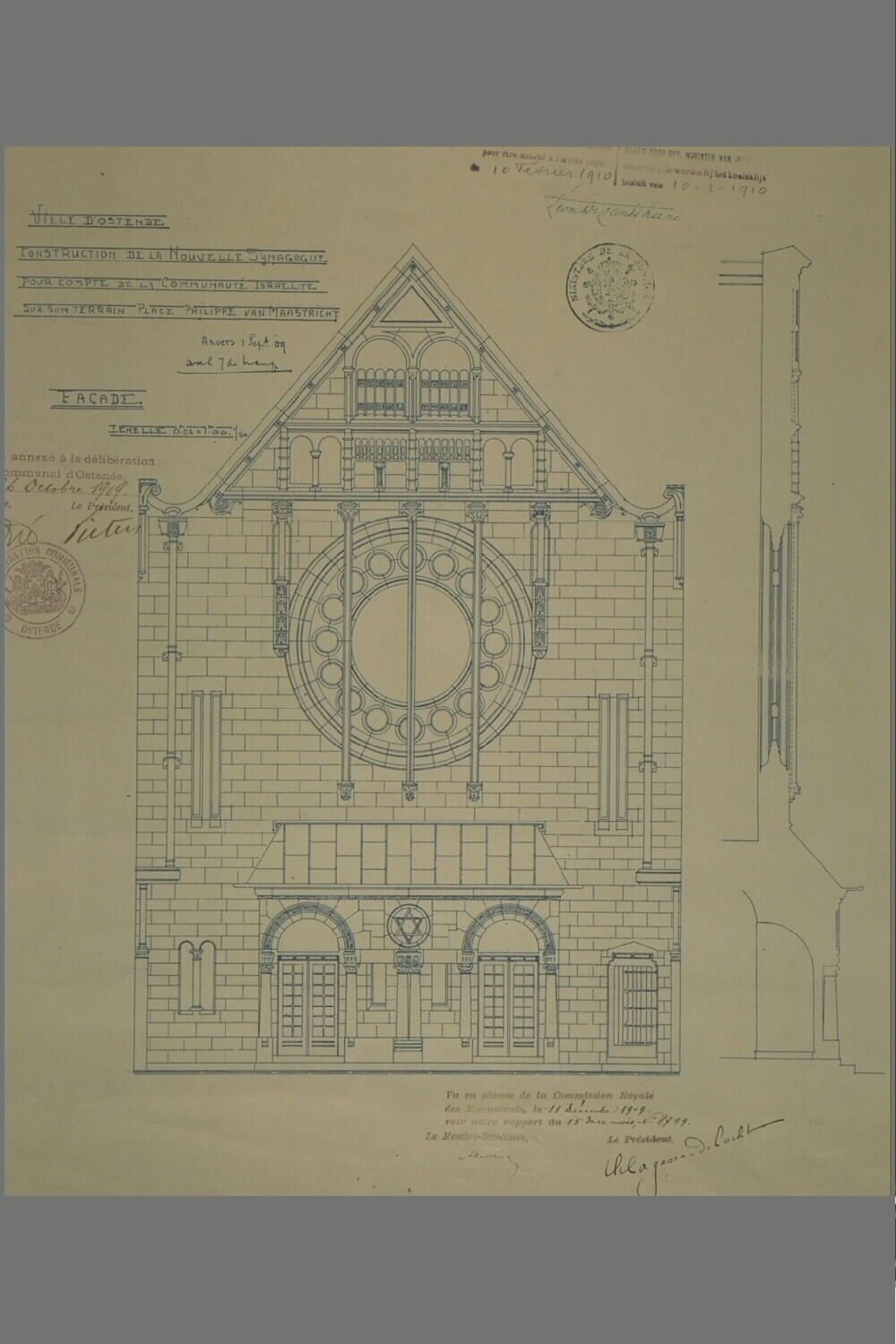 Alle rechten op de afbeelding 'Synagoge (Joseph De Lange): plan, voorgevel aanzicht, doorsnede gevelopstand' gemaakt door Pauwels, Oswald zijn voorbehouden aan Pauwels, Oswald.