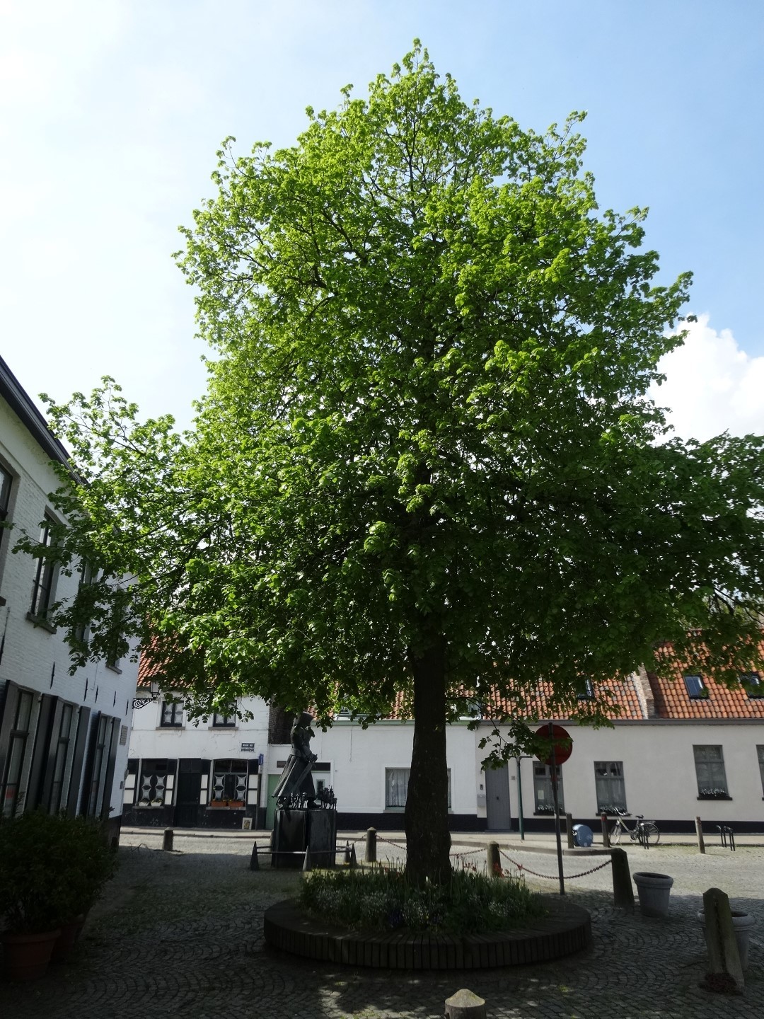 Opgaande linde als herdenkingsboom op het dorpsplein van Lissewege