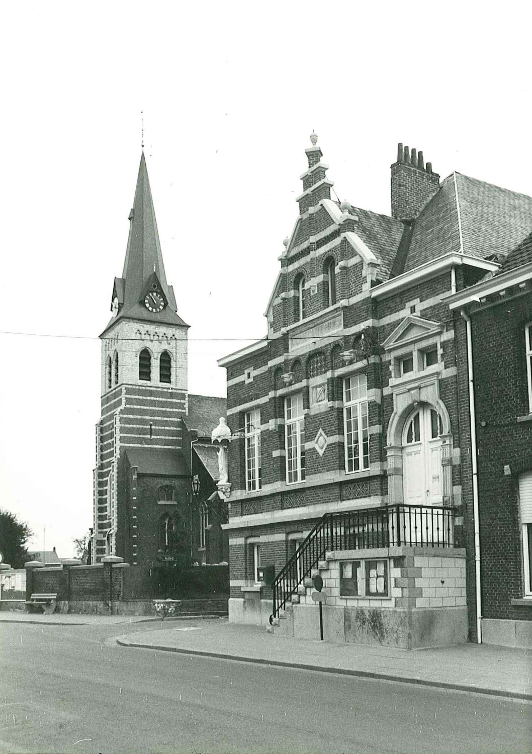 Gemeentehuis van Waarloos met parochiekerk Sint-Michiel op achtergrond