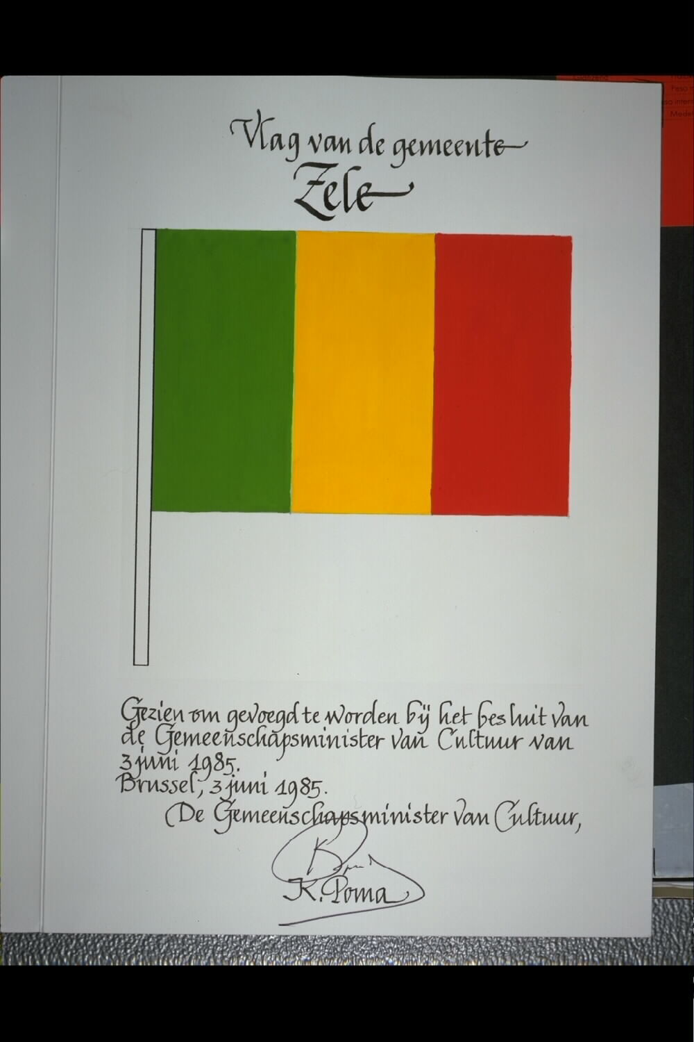De afbeelding 'Zele Vlag' wordt ter beschikking gesteld door Agentschap Onroerend Erfgoed (AOE) onder de volgende voorwaarden: Modellicentie voor gratis hergebruik, Naamsvermelding 4.0 Internationaal.