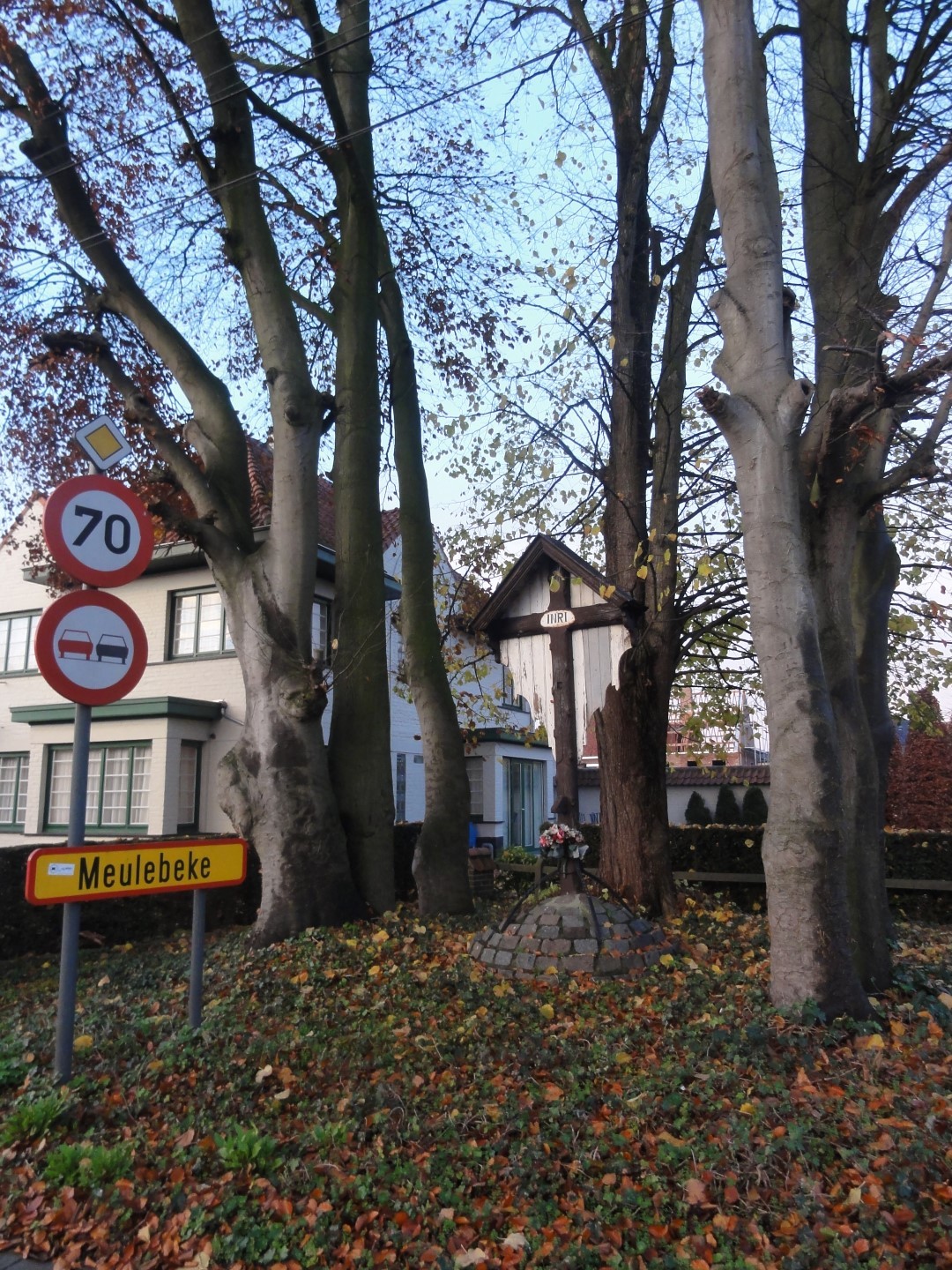 De afbeelding 'Meulebeke Bruggesteenweg detail Bruine beukengroep met Calvariekruis' gemaakt door Himpe, Koen wordt ter beschikking gesteld door Agentschap Onroerend Erfgoed (AOE) onder de volgende voorwaarden: Modellicentie voor gratis hergebruik, Naamsvermelding 4.0 Internationaal.