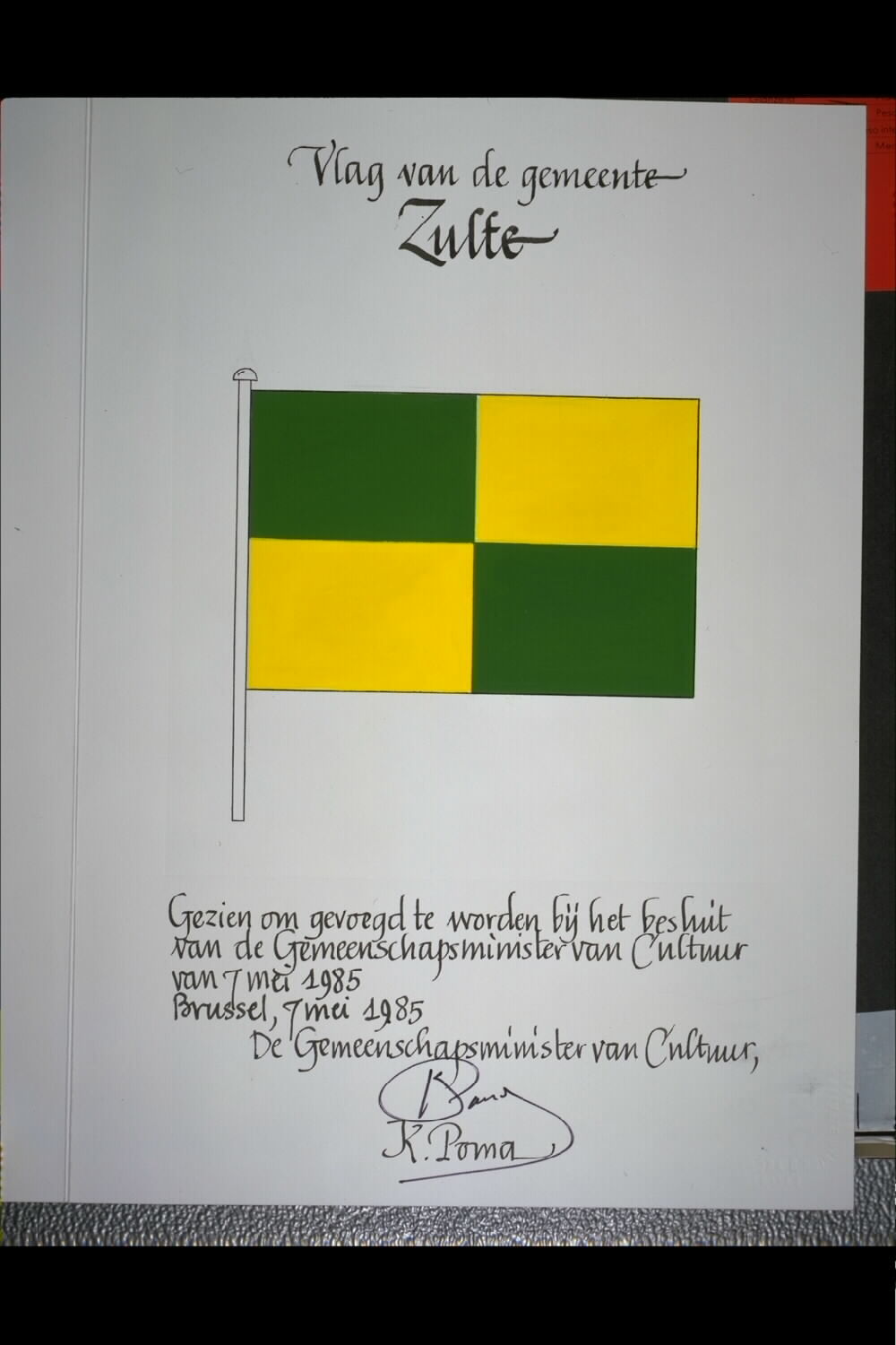 De afbeelding 'Zulte Vlag' wordt ter beschikking gesteld door Agentschap Onroerend Erfgoed (AOE) onder de volgende voorwaarden: Modellicentie voor gratis hergebruik, Naamsvermelding 4.0 Internationaal.