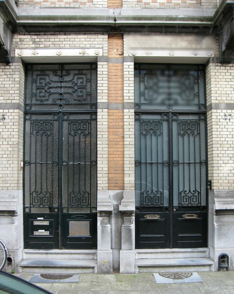 De afbeelding 'Antwerpen Robert Molsstraat 45-47 deuren' gemaakt door Braeken, Jo wordt ter beschikking gesteld door Agentschap Onroerend Erfgoed (AOE) onder de volgende voorwaarden: Modellicentie voor gratis hergebruik, Naamsvermelding 4.0 Internationaal.