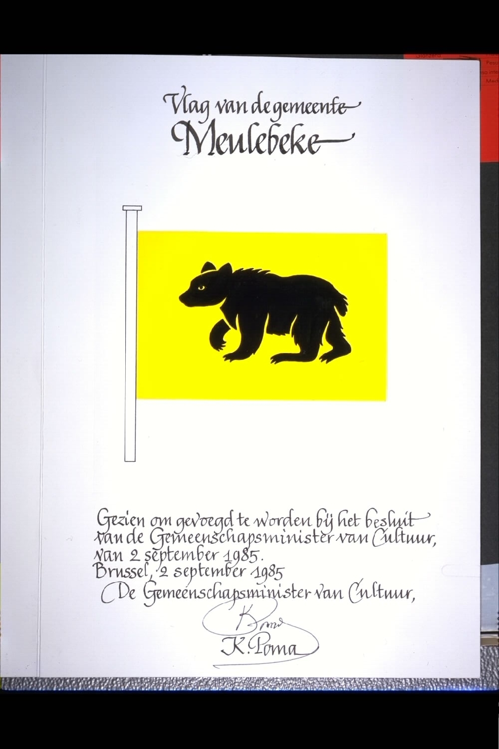 De afbeelding 'Meulebeke Vlag' wordt ter beschikking gesteld door Agentschap Onroerend Erfgoed (AOE) onder de volgende voorwaarden: Modellicentie voor gratis hergebruik, Naamsvermelding 4.0 Internationaal.