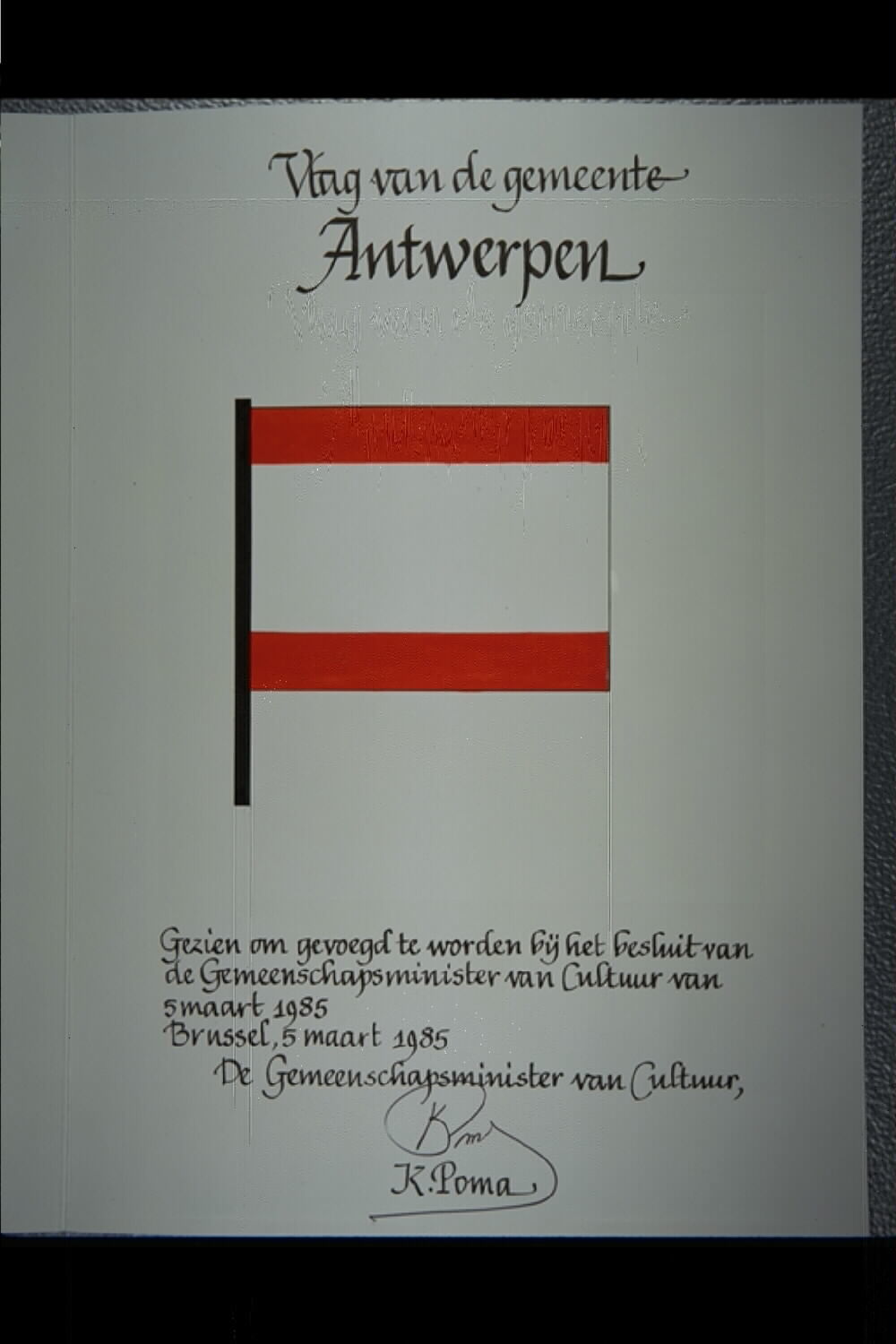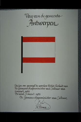 De afbeelding 'Antwerpen Vlag' wordt ter beschikking gesteld door Agentschap Onroerend Erfgoed (AOE) onder de volgende voorwaarden: Modellicentie voor gratis hergebruik, Naamsvermelding 4.0 Internationaal.