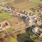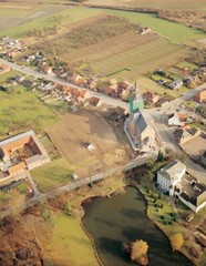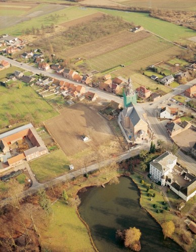 Alle rechten op de afbeelding 'Luchtfoto vanuit het zuidenmet links van de kerk, het kasteel van Melveren, rechts de oude pastorie en er tegenover de nieuwe' zijn voorbehouden aan Stad Sint-Truiden.