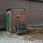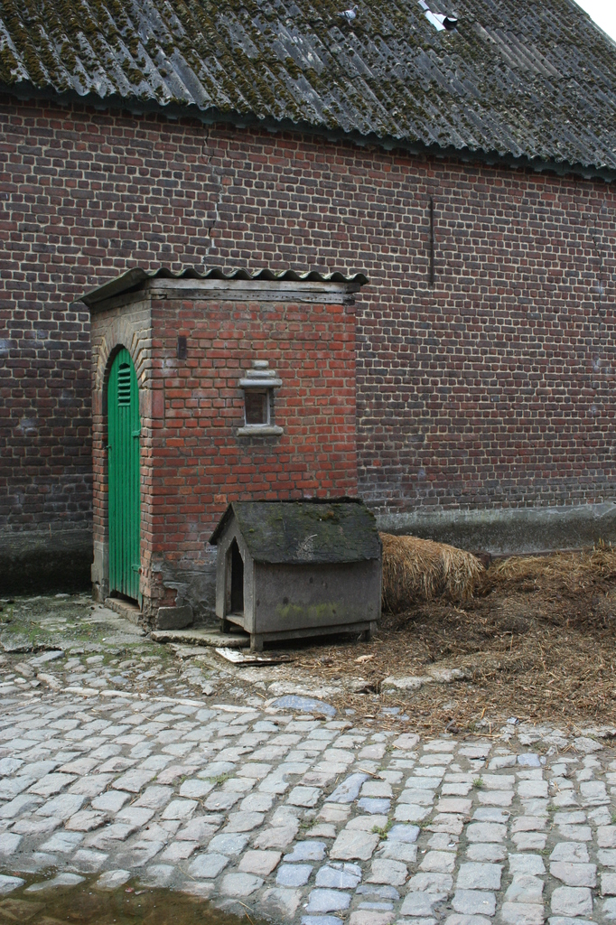 Houten hondenhok en bakstenen gemakhuisje.
