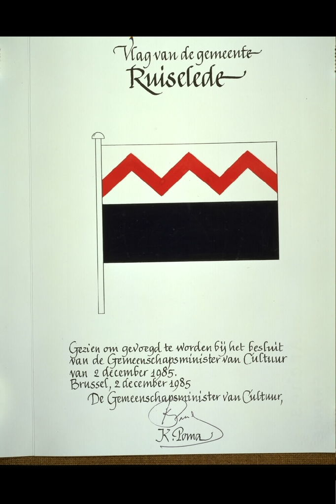 De afbeelding 'Ruiselede Vlag' wordt ter beschikking gesteld door Agentschap Onroerend Erfgoed (AOE) onder de volgende voorwaarden: Modellicentie voor gratis hergebruik, Naamsvermelding 4.0 Internationaal.
