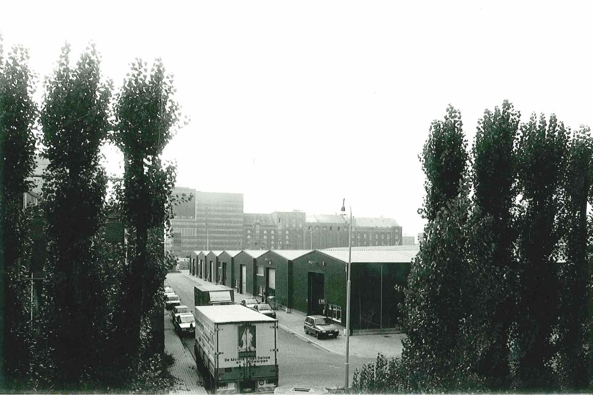 Zicht vanop Deurnsebaan (brug) naar het Westen op Griffinstraat met in de verte de Westkaai met de Molens van Deinze en Antwerpen