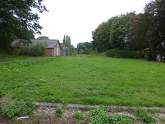 Terreplein met loodsen. Rechts op de foto is de aarden dekking (met bomen) van het officierengebouw zichtbaar.