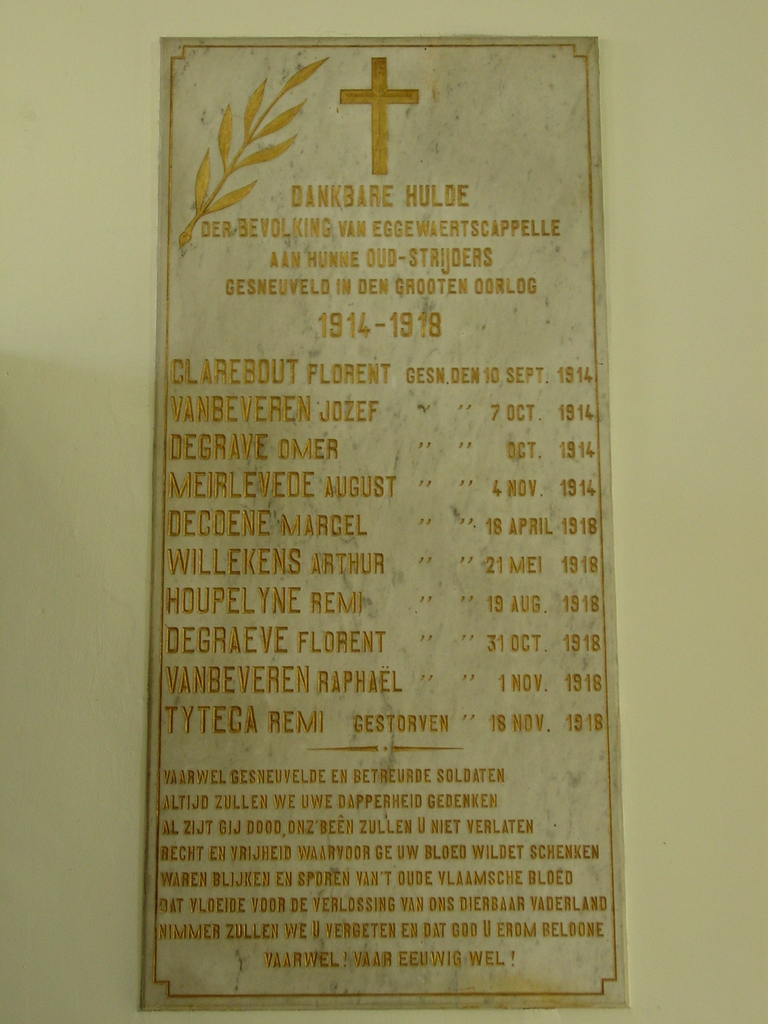 De afbeelding 'Eggewaartskapelle: Kerk: Gedenkplaat militaire doden Eerste Wereldoorlog' gemaakt door Decoodt, Hannelore wordt ter beschikking gesteld door Agentschap Onroerend Erfgoed (AOE) onder de volgende voorwaarden: Modellicentie voor gratis hergebruik, Naamsvermelding 4.0 Internationaal.