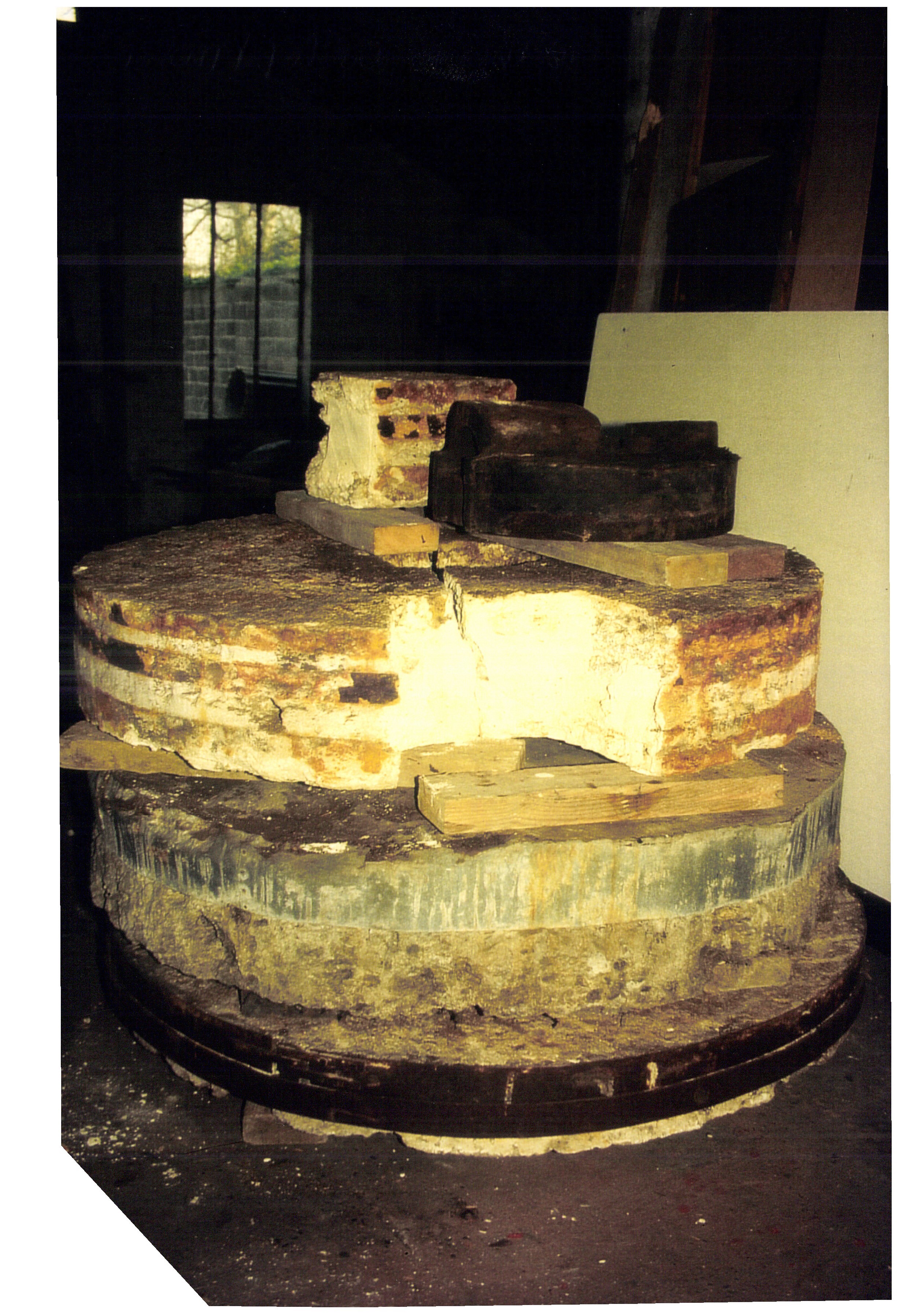 Opschrift achterzijde afbeelding: "molenstenen/onderaan: ligger achtermolen/midden: loper achtermolen/boven: uiteengevallen ligger voormolen/erop: gesmede pan uit brasen"